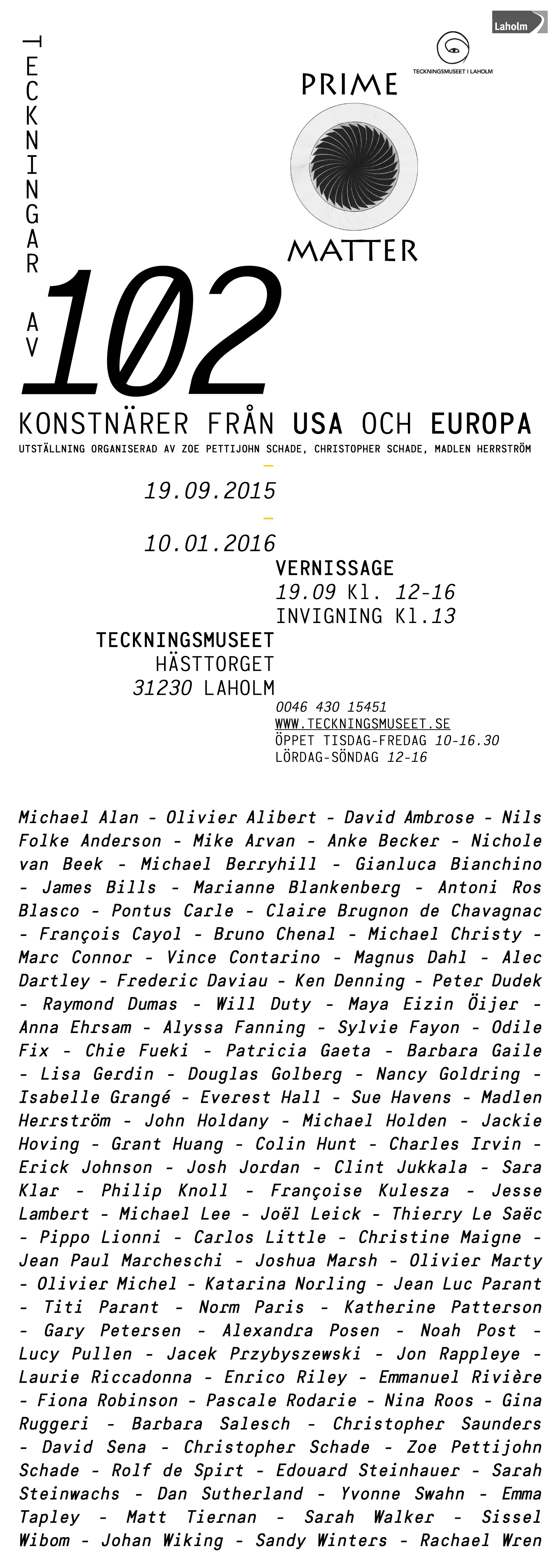 The Laholm Drawing Museum: Sept 19 – Oct 1, 2015. The idea for Prime Matter began with the desire to see the range and abundance of approaches that arise from one of the most fundamental modes of art making – basic drawing. An illuminating exhibition which explores how different artists use drawing in their practice. Originating in New York, this year the project shows the work of 102 artists from USA, Europe and examines approaches to drawing across continents, cultures, languages, and contexts.